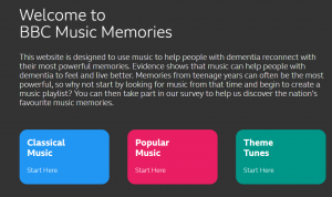 Music Mirrors is a simple digital resource made with people at an early stage of memory loss linking their life stories to recorded music and sound in a way that is easily accessible and portable throughout their journey with dementia. The concept was developed by ‘Come Singing’ a voluntary organisation in Norfolk, and Norfolk and Suffolk NHS Foundation Mental Health Trust. It is used by and can be shared between people at home, hospital, care homes and third sector organisations as a reminiscence tool and contributes to person centred care by stimulating conversation and engagement.